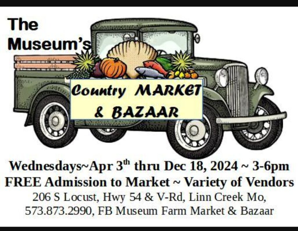 Join us every Wednesday from 3–6 PM at the Camden County Museum in Linn Creek for our Country Market & Bazaar!
